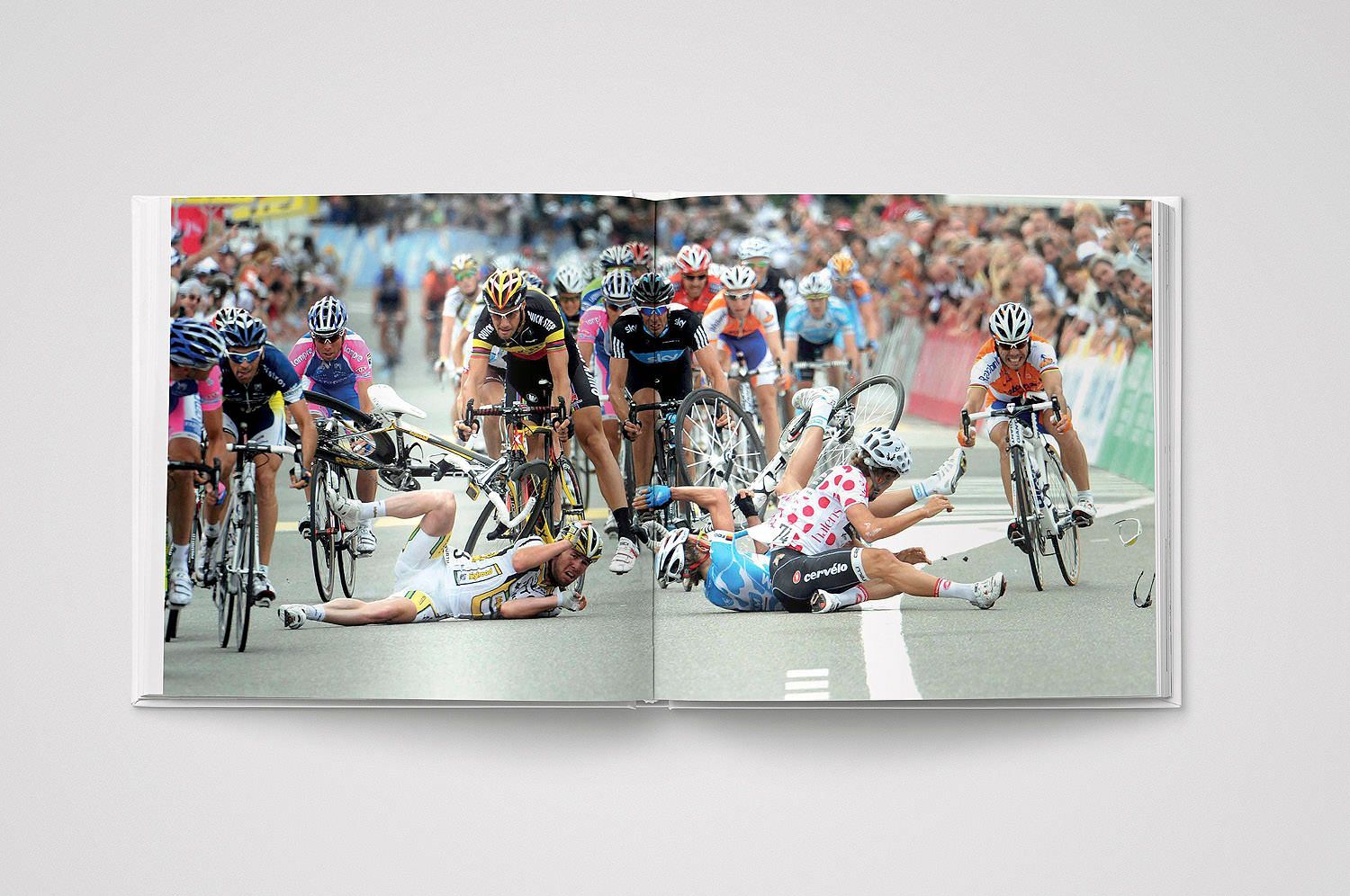 So, let's start at the front shall we - with the cover. How do you choose the cover shot for a book of such historical longevity and generational expanse? And from a sport so colourful, beautiful, and so full of variety? When do you choose the cover shot? In fact, we put a few options on to the designer's table early-on in the production, then let them ferment and percolate a while as the main body of the book grew. The cover shot then came down to three choices: a generic scenery shot, a generic action shot; or one of my classical shots from the not-so-recent past. We opted for a sprint shot because of the dynamism of the sprinters going for the line in a stage of the 2011 Tour of Oman. The timeless nature of the shot and the energy within it caught our eyes the most. That and the bleached-out background which made virtual silhouettes of the cyclists. The white-out and black shadows also formed two design elements of the book, at least as far as the hard-cover board and slip cases are concerned. A dramatic cover is considered by many people to be the most important element when selling a book. I don't disagree, but also consider it as just that - a cover, sometimes never to be looked at once the reader opens the first few pages and is drawn into the main body of the book. Still, it is the first time one of my books has had a sprint shot as the cover.