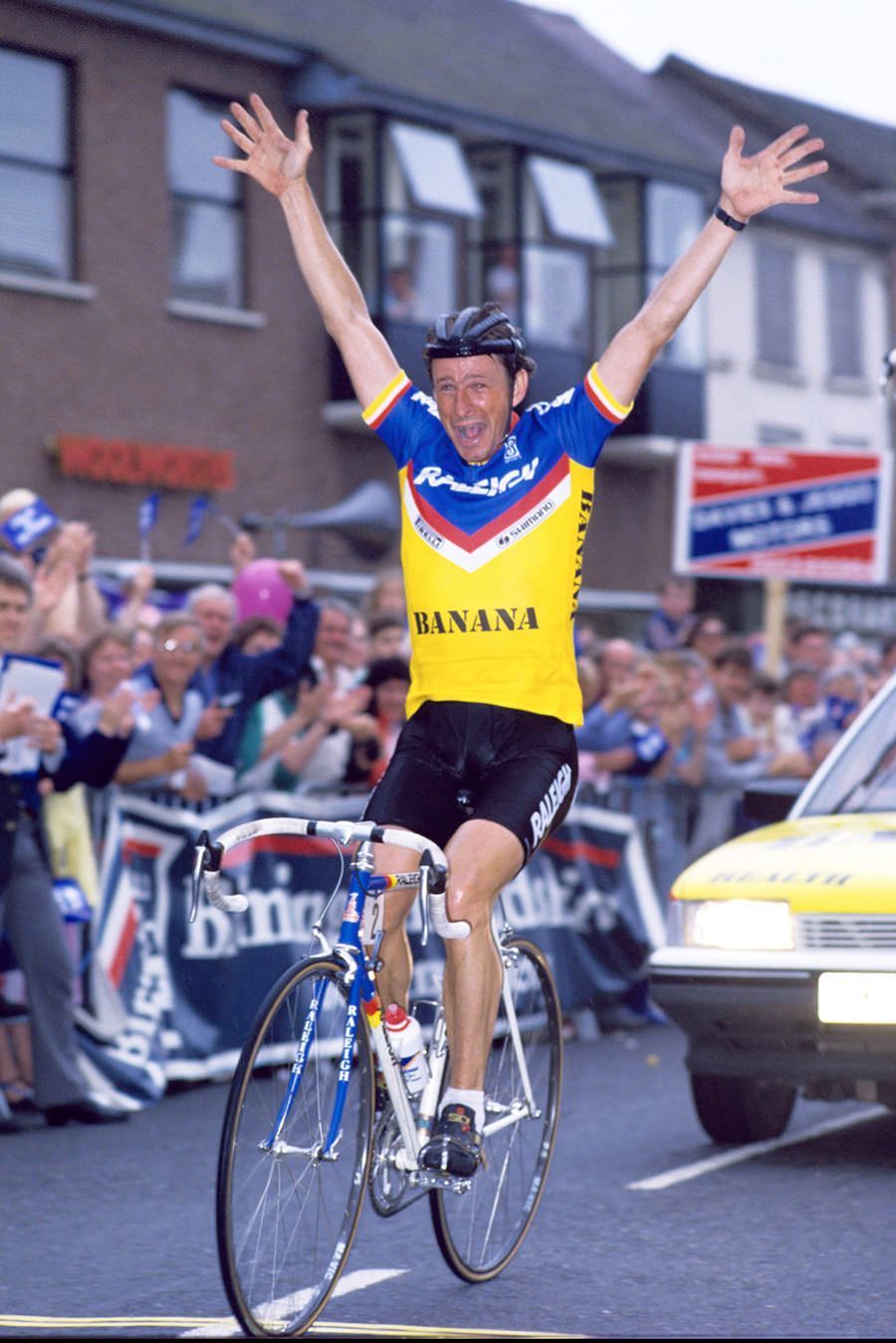 The Kellogg’s series of criterium races kicked off in the UK and Ireland in 1983, with Paul somewhat in the driving seat when it came to deciding how the exciting races would pan out. I never did figure out which camp he was in, but someone had to apply serious diplomacy in order that the UK-based pros’ won at least as much as their European invaders. In fact, there were three sets of people to appease – those who were UK-based, those who formed a Dutch/Belgian axis, and then the likes of Paul, Sean Yates, Stephen Roche, Sean Kelly, Graham Jones, Robert Millar, Phil Anderson, Allan Peiper and many, many more. I got the impression the UK riders didn’t trust the English-speaking euro-based riders led by Paul, who were more likely to be in bed with the Dutch and Belgians. I think Paul thrived on teasing his colleagues on both sides of the fence, and as the iconic series of races fizzled out in the mid-1980’s, to be overlapped and then replaced by the Tour of Britain and Tour of Ireland, Paul had had the intelligence to look after his own future – he would ultimately end his racing career in the colours of the UK-based Raleigh-Banana team.