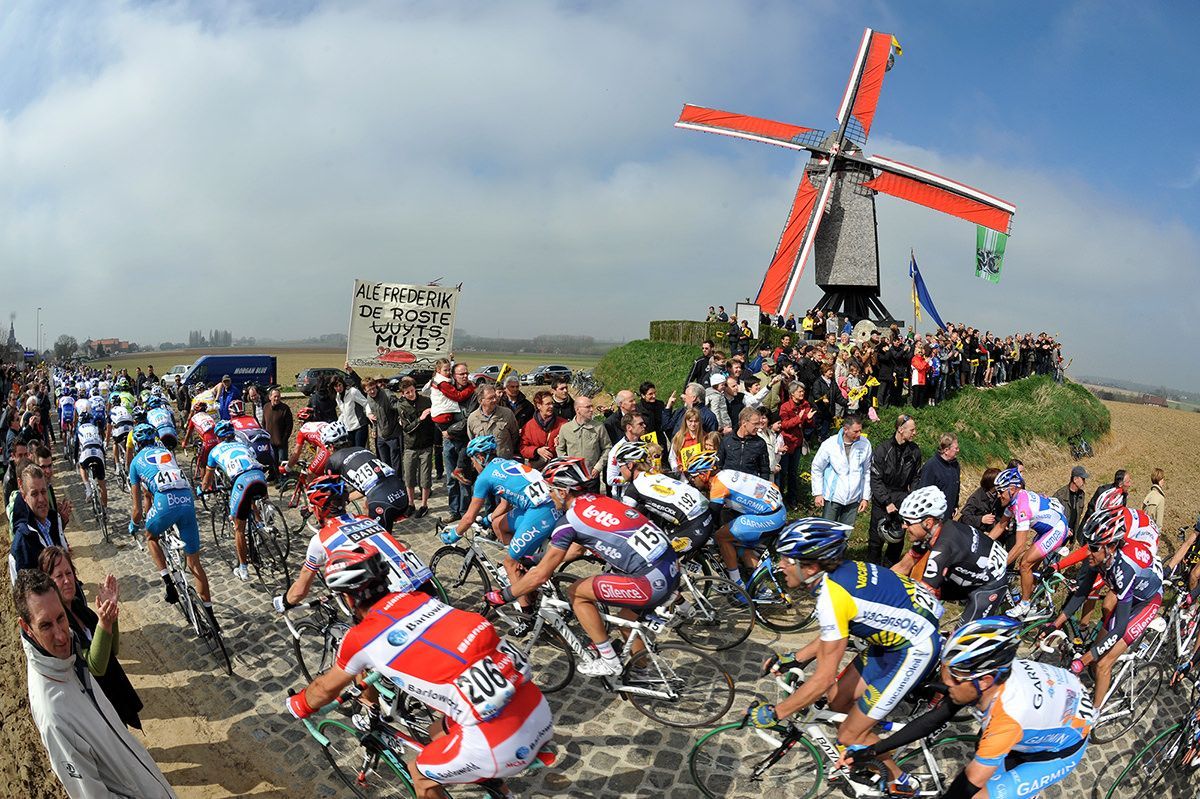 I learnt to remember landmarks like decrepit windmills or prominent churches as a way of telling me where I was in the race. A huge brewery still dominates the road immediately just after the Holleweg cobbles – you just know the Molenberg is five minutes away when you pass its imposing frontage. As my knowledge and experience of the race grew over the years, with it came a wisdom that sometimes allowed me to actually enjoy the big day. Part of the trick to following the Tour of Flanders is just pick out the best bits, like plucking only the best cherries from a tree. To know when a scenic shot is more important than action. The first priority was the iconic windmill perched above some terrible cobbles at Wannegem-Lede, almost three hours into the race, so decision No.1 made. But if I stayed too long at that windmill, I also ran the risk of not getting to the Oude Kwaremont, usually the first climb of the day, from where most Tours of Flanders usually kick-off.
