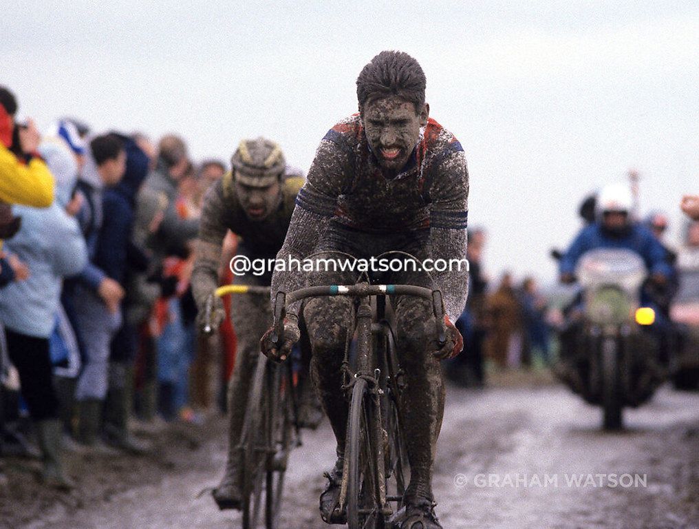There was no doubting the quality of the winner when I first saw the ‘Hell of the North” in 1980. I’d caught a pre-dawn ferry from Dover to Calais and then cycled the 130-kilometres to find the race near Gruson, just after the infamous pavé of the Carrefour de l’Arbre. I didn’t have long to wait before the preceding race cars started passing me, then the motos of the Gendarmes, and the motos of TV and stills photographers too. Then the first cyclist emerged from the dust, moving with frightening speed along the softer edges of the cobbled track. He was instantly recognisable as Francesco Moser, his familiar pointy nose almost down on his stem, his mouth wide-open, his elbows locked at 90-degrees, and his back arched so low and so level over his bike. I knew just about enough of the race to realise Moser was on his way to winning, for no one lost at the speed he was racing at, not that close to the finish, and not after the course he’d ridden over. Moser had won the two previous editions of the race as well, and I felt absolutely chuffed to have captured my first-ever image of this ‘star.