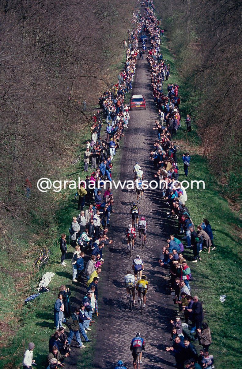 Some of the worst crashes have happened in the forest, such as Johan Museeuw’s in 1998, or Philippe Gaumont’s in 2001, and they almost always happened about 500-metres in, at a point where the descent into the forest levelled out and a patch of evil stones threatened to take down any front wheel that wasn’t properly grounded. Some of the gaps in the pavé are where fans have later come back and removed stones to put on display at home, a selfish deed likely to cause injury to the very heroes they worship. I’ve seen cyclists bunny-hopping the worst cobbles, yet not always making it safely - I watched Rolf Sorensen crash out in 1991, in the exact same place that injured Museeuw and Gaumont some years later, as well as Mitch Docker in 2017.